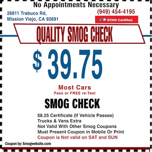 Are you looking for a hassle-free and low-cost Smog check service in Mission Viejo, CA? Look no further than Smog Check Mission Viejo. We are a STAR certified Smog station that can handle any vehicle, including cars, trucks, SUVs, vans, and RVs. We offer friendly and professional service, free retests, and a convenient location at 41590 Date Street, Mission Viejo, CA 92562.